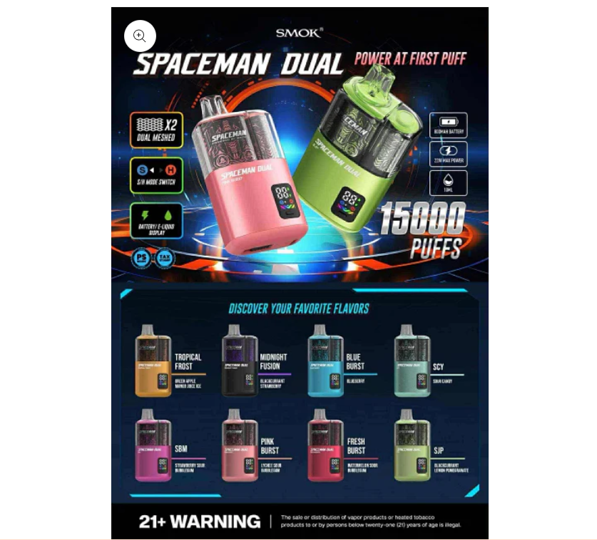 SMOK Spaceman Dual 15000​ – Step into the future of disposable vaping, where advanced performance meets intuitive design. Crafted for vapers who want it all—massive capacity, rich flavor, and powerful output—the Spaceman Dual 15000 delivers a truly next-generation experience. With a 15,000-puff lifespan, adjustable draw modes, and a clear power display, it’s built for consistent, satisfying sessions every time.